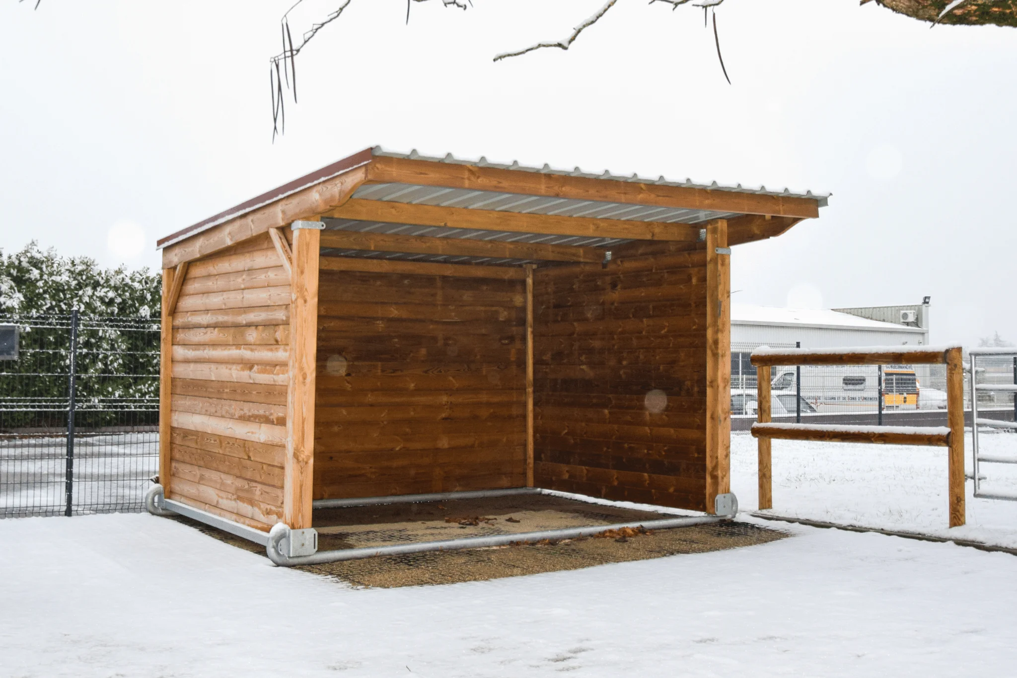 Abri bois tractable 3×4 m, pin sylvestre classe IV, toit bac acier, sans autorisation de construction, pour 2‑3 chevaux, hauteur 2,30‑2,50 m, garantie 10 ans.