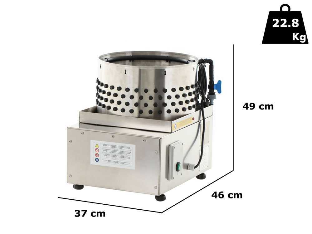 Plumeuse à panier semi-professionnelle Dominion DIT 35, équipée de 277 doigts souples, moteur 180 W, alimentation 220 V monophasé. Capacité de production de 250 à 300 pièces par heure.